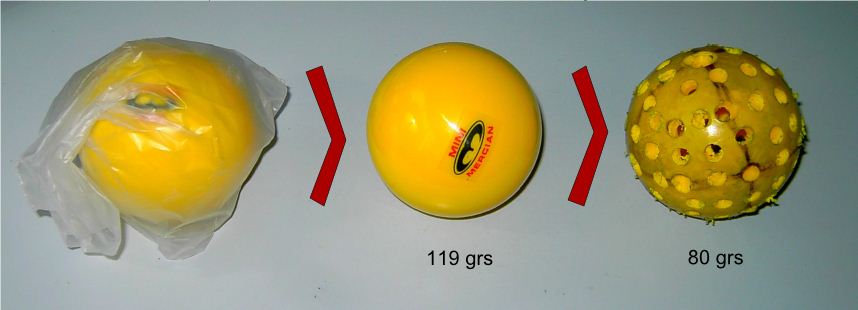 Las bolas tienen que tener un diámetro de 6,7 cm, y debe de ser de color. (verde brillante, naranja).